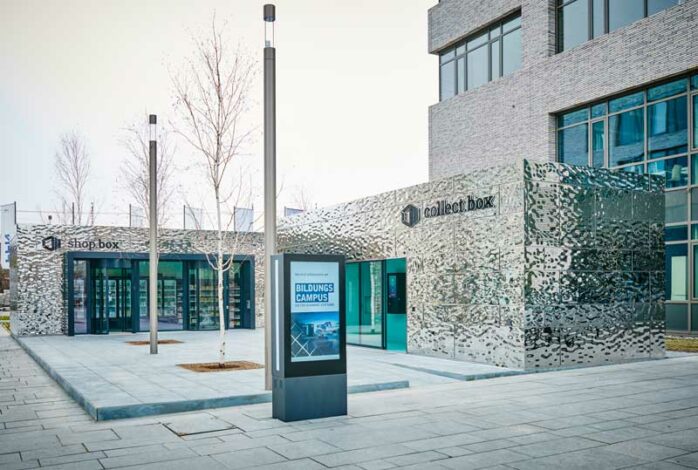 shop.box – Um Zugang zur shop.box zu erhalten, müssen die BesucherInnen sich die App der shop.box herunterladen. Nach erfolgreicher Anmeldung kann innerhalb der App ein QR-Code generiert werden, welcher an der Eingangstür mittels Scanner gelesen werden kann. Das Sortiment umfasst eine Reihe von alltäglicher Ware, welches vor allem an die Bedürfnisse des Bildungscampus angepasst wurde. Das Besondere ist, dass Besucher den Laden ohne Scan- und Bezahlvorgang wieder verlassen können. Im Laden sind Kameras und weitere Sensoren installiert, welche mit Hilfe von Künstlicher Intelligenz den Warenkorb automatisiert erfassen und bei Verlassen des Ladens den Zahlungsvorgang auslösen.